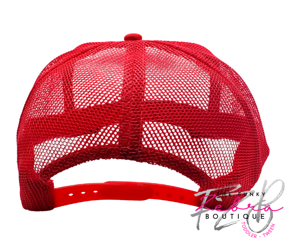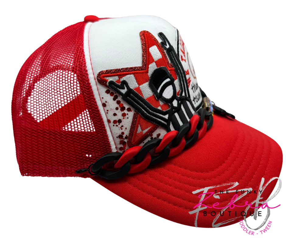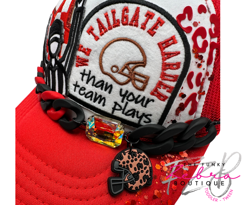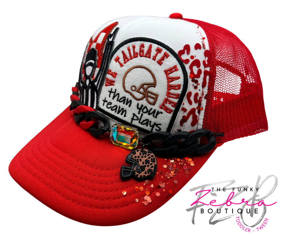 This sweet handmade foam trucker patch hat is a tailgaters dream. Layered designer patches including a red and white checkered star, touchdown ref and embroidered We Tailgate Harder Than Your Team Plays.Β A mixed red and black linking hat chain with chunky iridescent rhinestone and leopard print football helmet charm finish this hat off. A cluster of 2D red leopard print vinyl and glitter adds some pizazz. All adorned on an OTTO brand Adult white foam front trucker hat with red mesh back and adjustable snap closure.