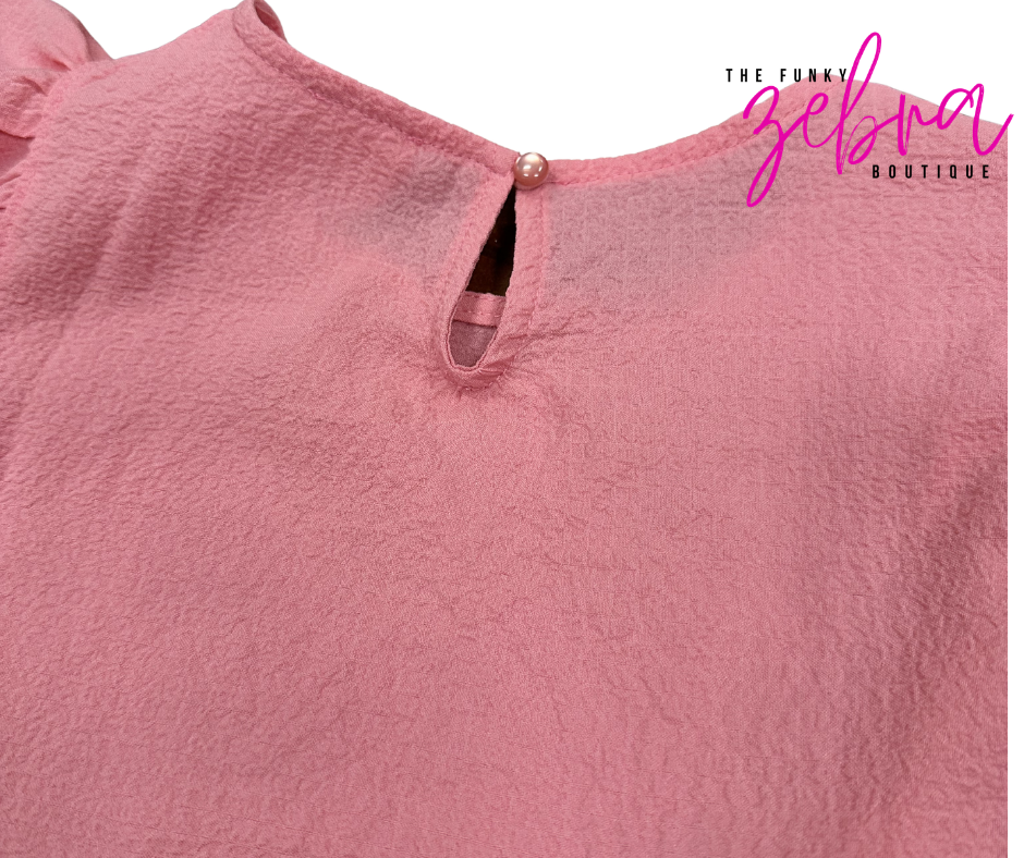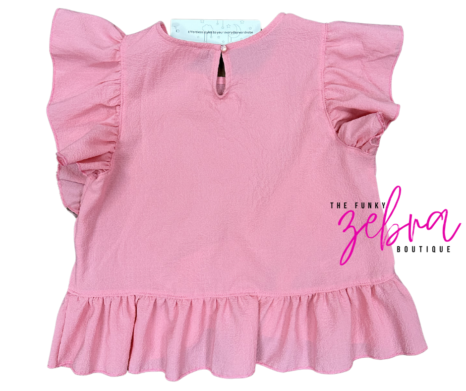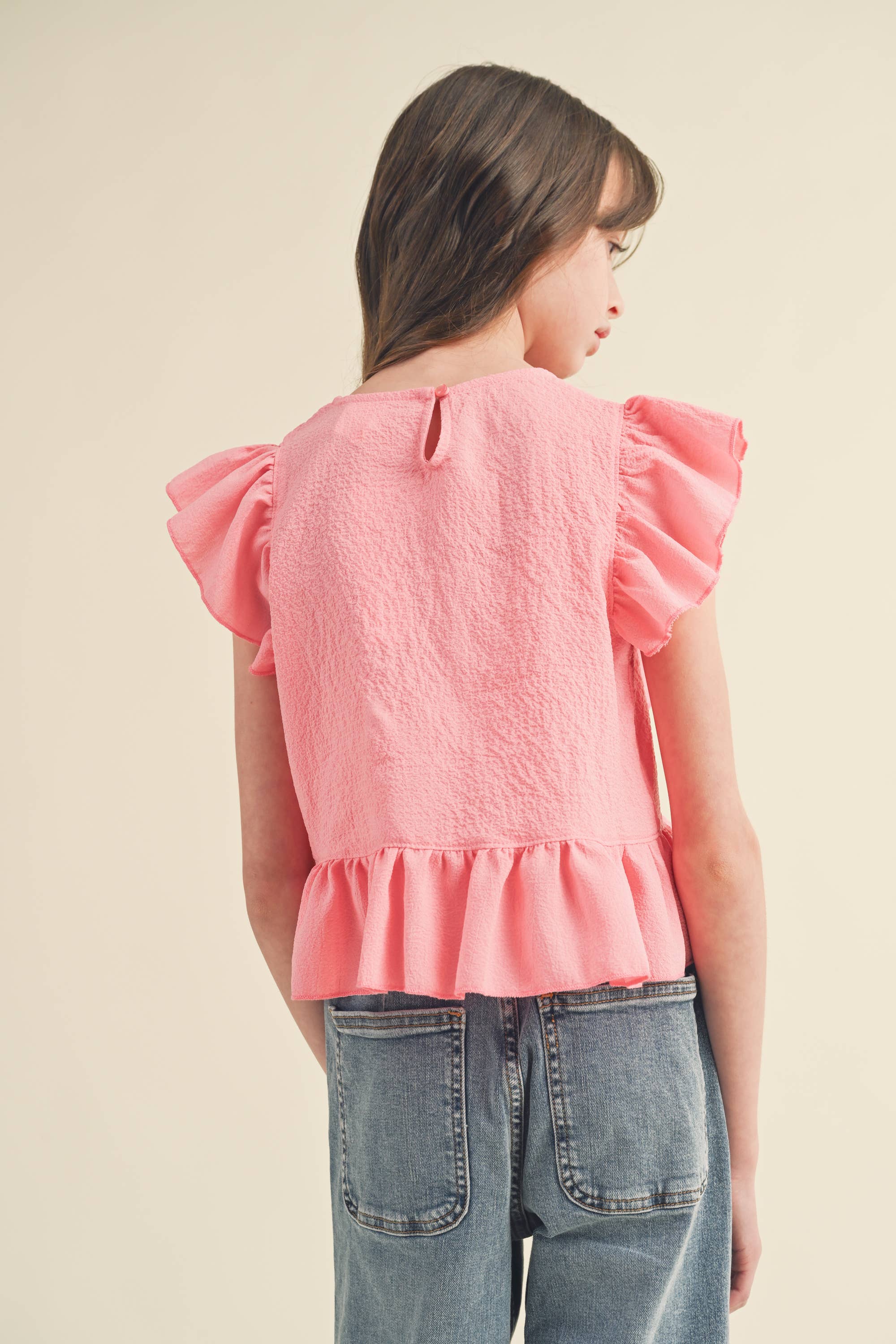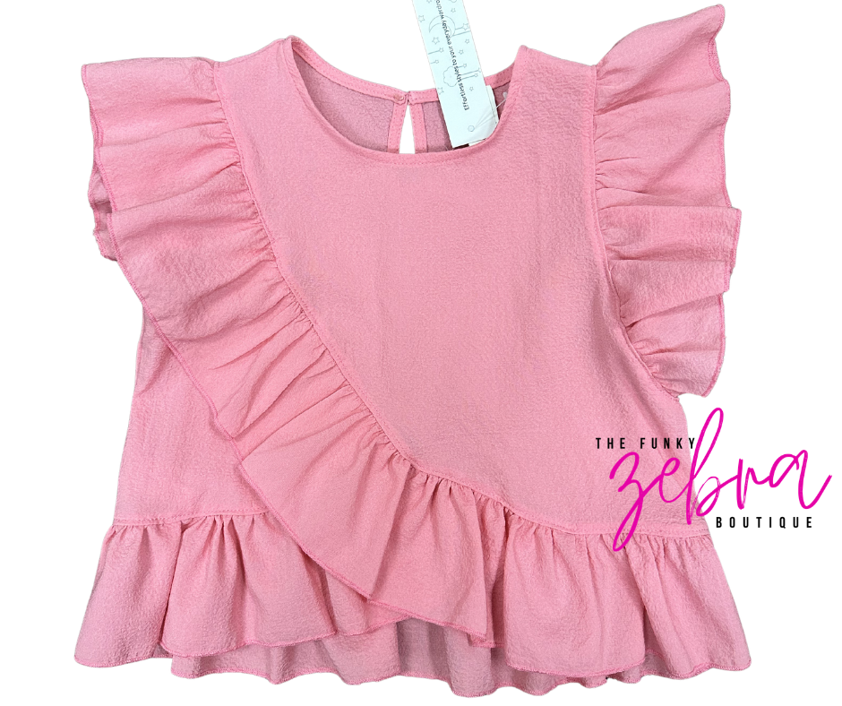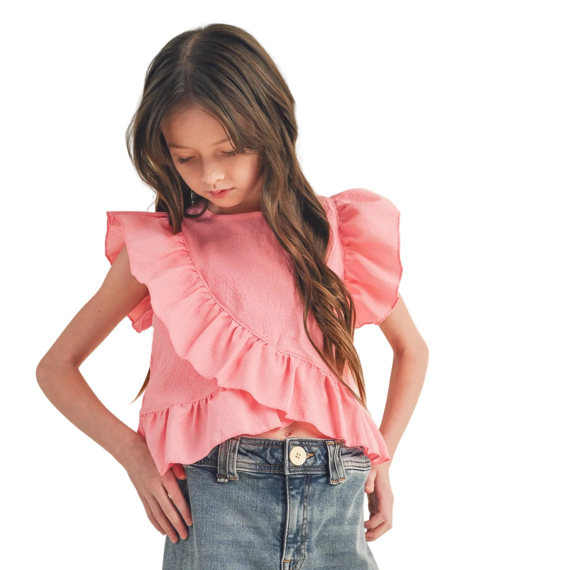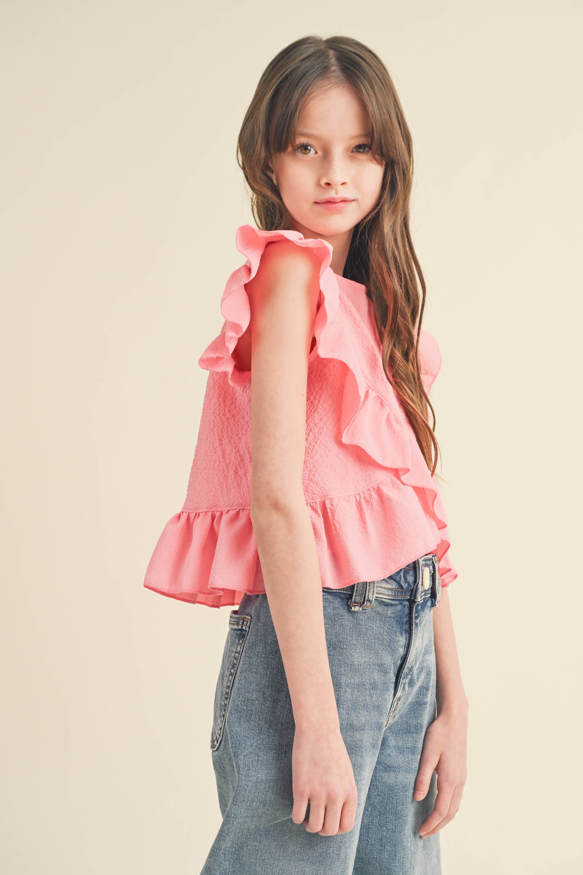 Add a fun pop of pink to her wardrobe with this asymmetrical sleeveless woven top. Featuring textured fabric, statement ruffle detailing, and a button-back closure, this top is both playful and stylish. Made from 100% polyester for a lightweight, easy-to-wear fit.
