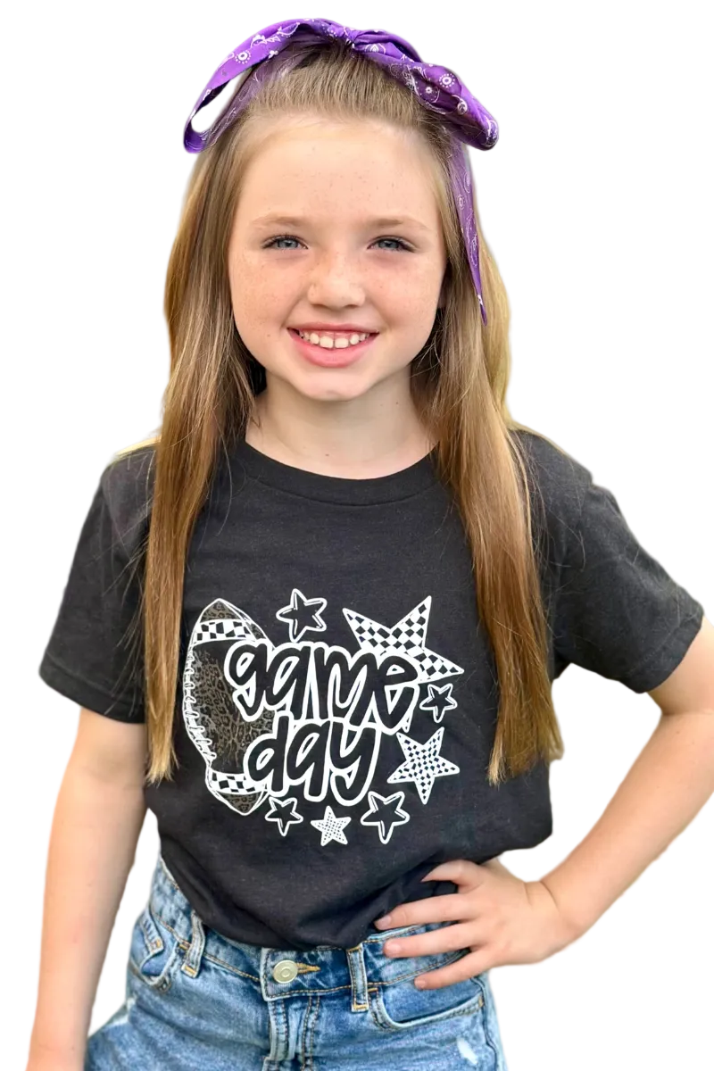 SaleGet ready to cheer in style with the Mini Game Day Tee! This black tee features a fun "Game Day" print with a leopard football, checkered stars, and plain stars, adding a playful twist to your game day outfit. Perfect for showing your spirit with a touch of flair and comfort.Β
