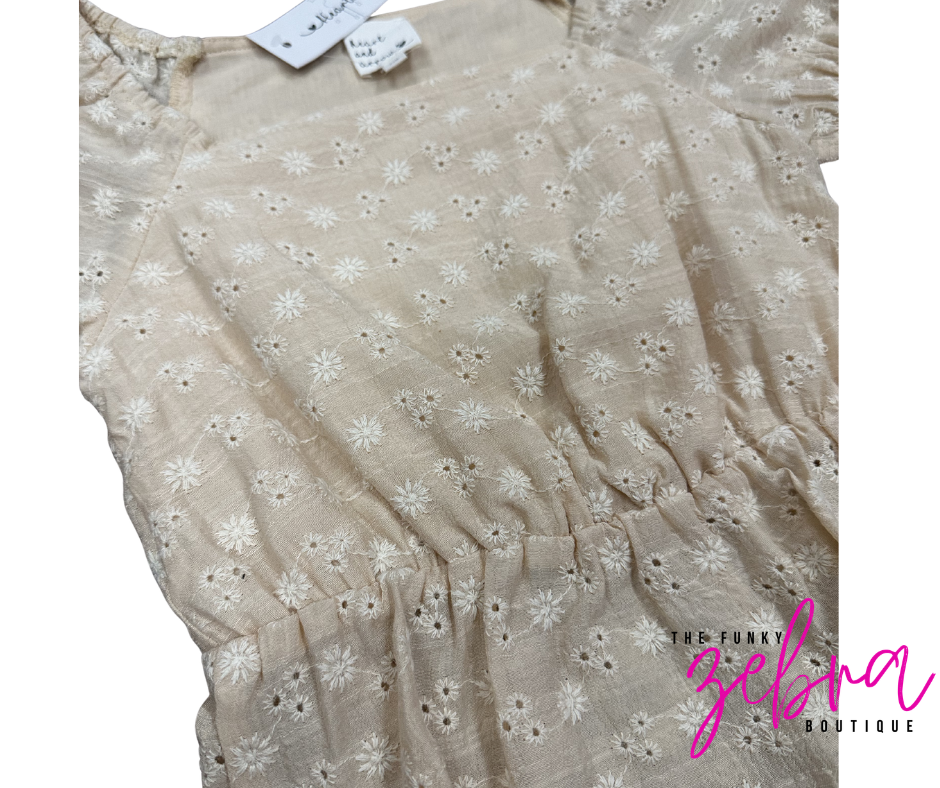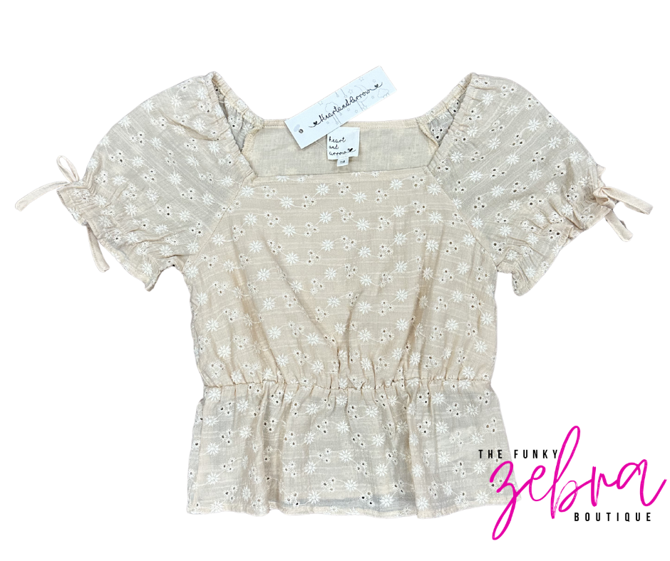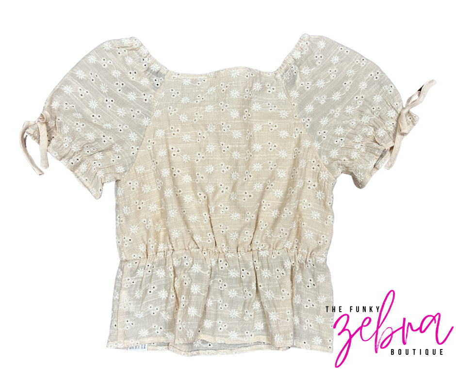 Sweet, soft, and effortlessly stylish, this light peach eyelet peplum top is the perfect blend of comfort and charm. Designed with delicate ditsy floral embroidery, this top features feminine puff sleeves and a flattering peplum silhouette that adds just the right amount of flair.