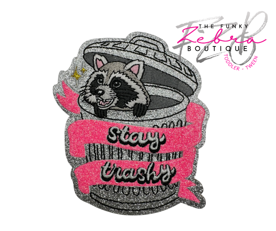 Stay Trashy Raccoon Glitter Trash Can Embroidered Iron On Patch
