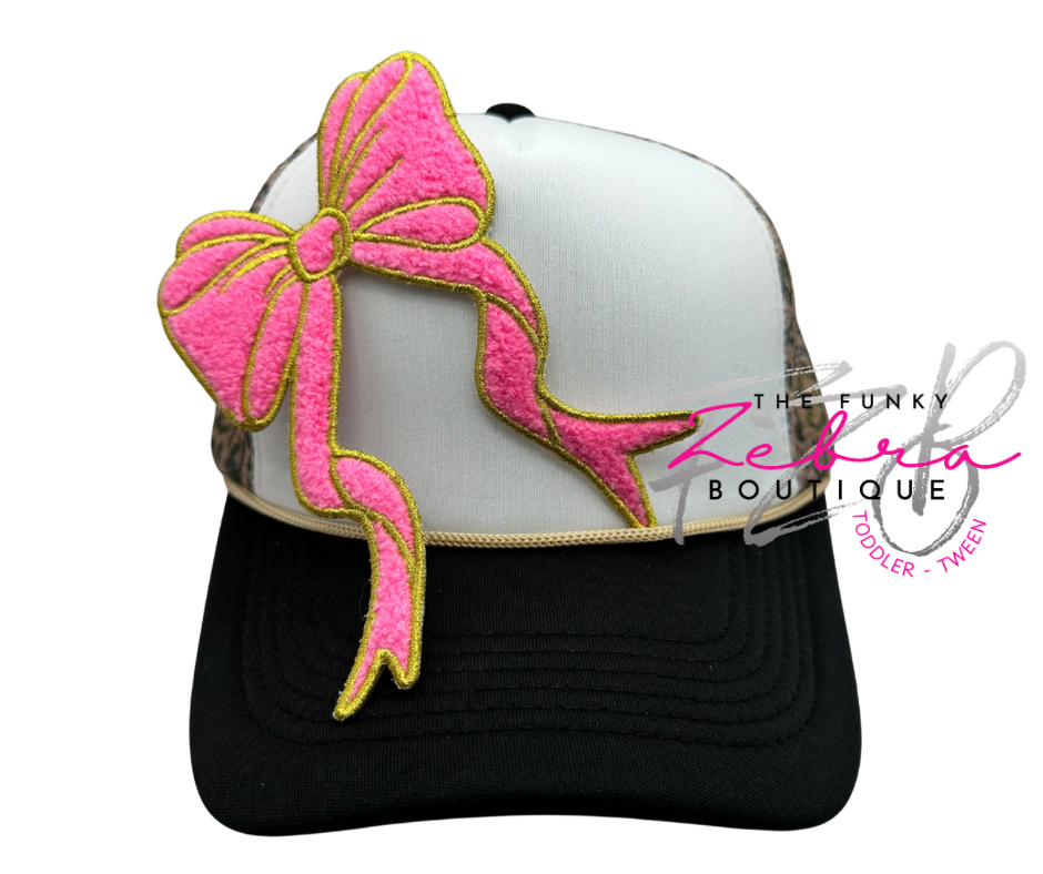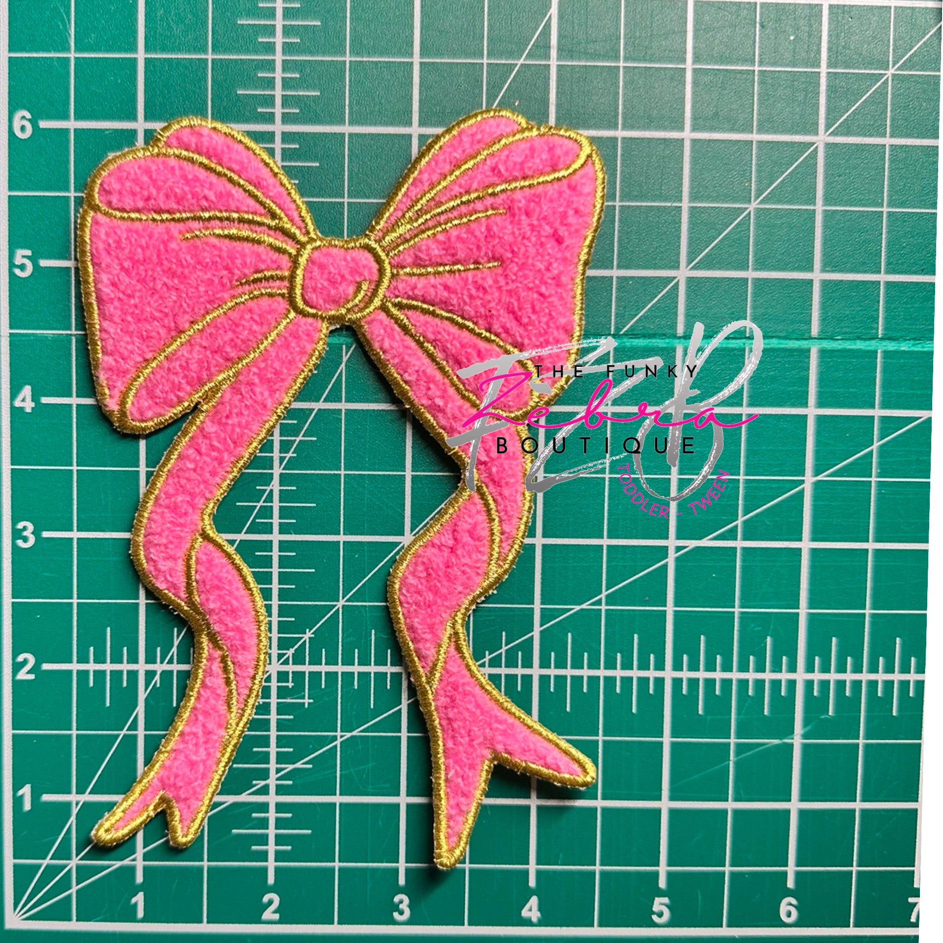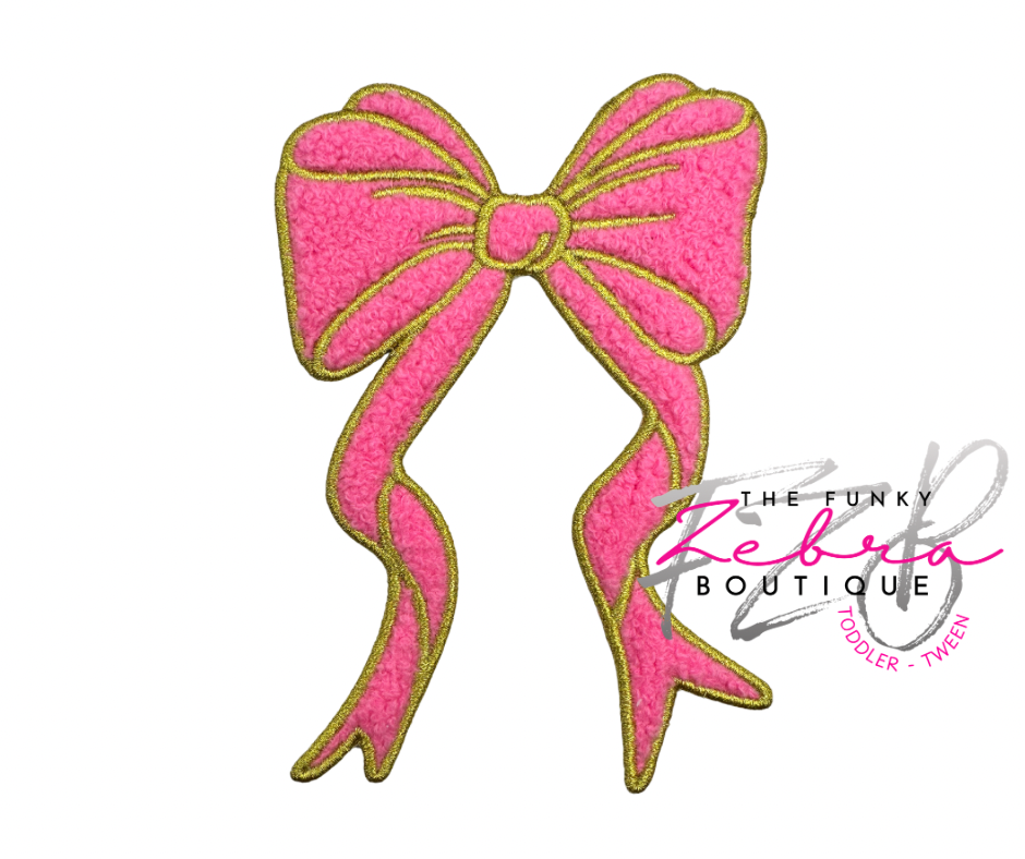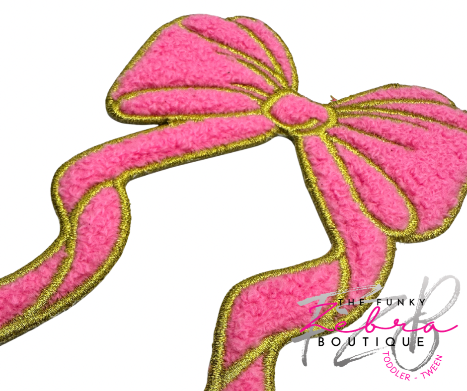 The sweetest long tail coquette bow in fluffy candy pink chenille and outlined in metallic gold thread.