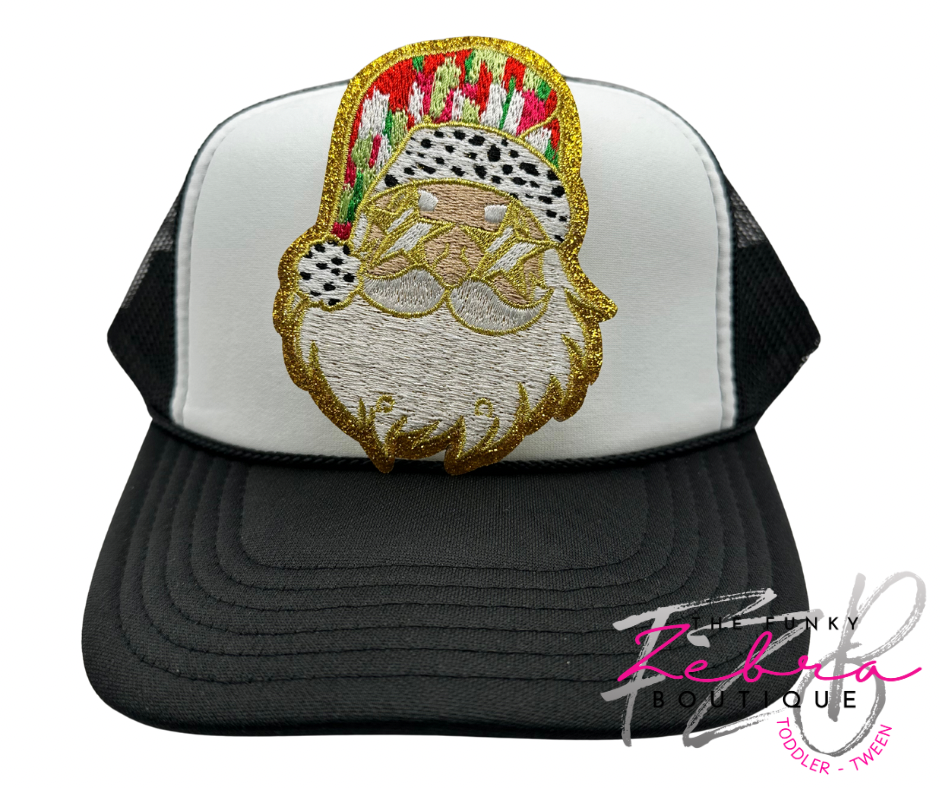 Star eyes Santa featuring a fun santa hat in black and white polka dot, Dalmatian print. A fun mix of Christmas colors and gold glitter.
