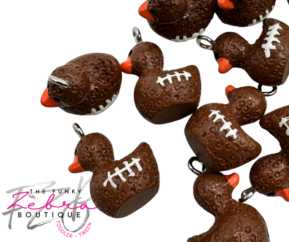 A fun set of twelve football duck charms. Perfect for crafts, necklaces or any creative project you envision. Each charm comes complete with attached screw eyes for effortless use. Let your imagination run wild!