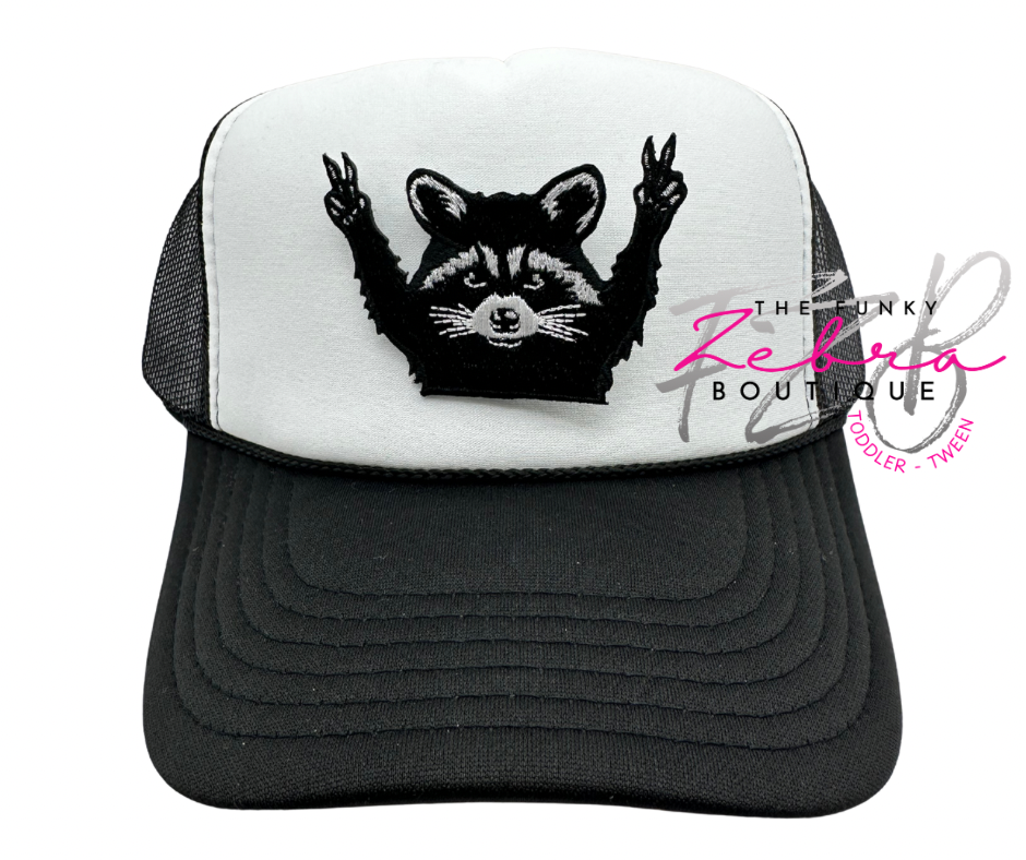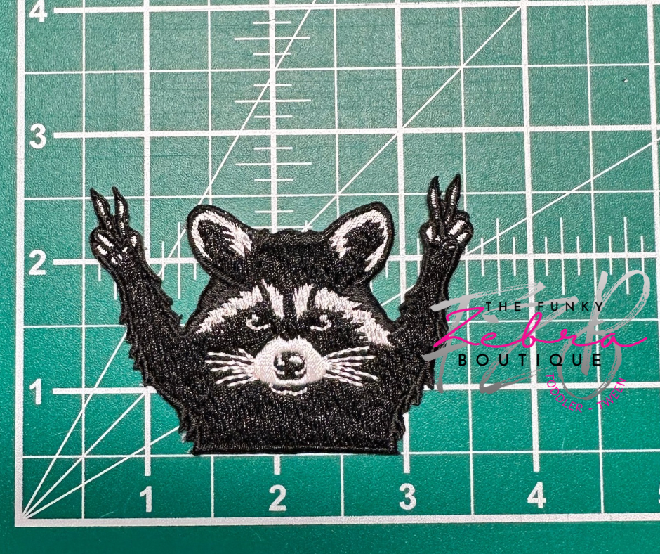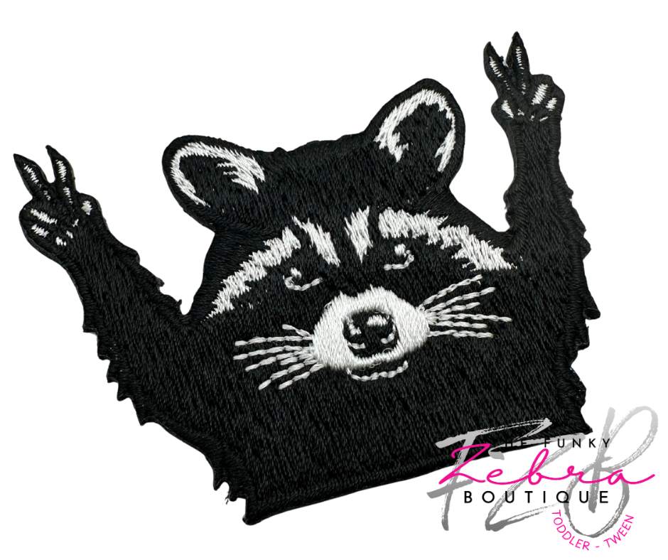 Rock out with this fun black and white, peace sign throwing, raccoon.