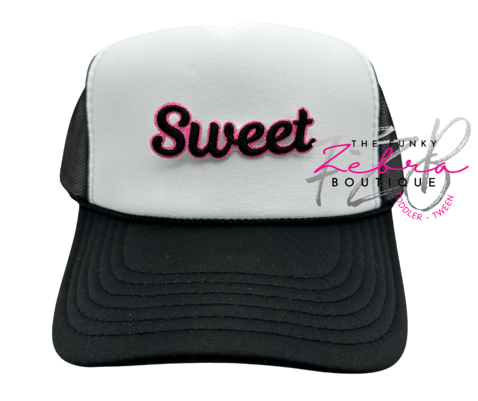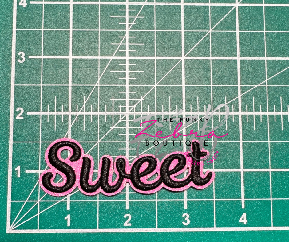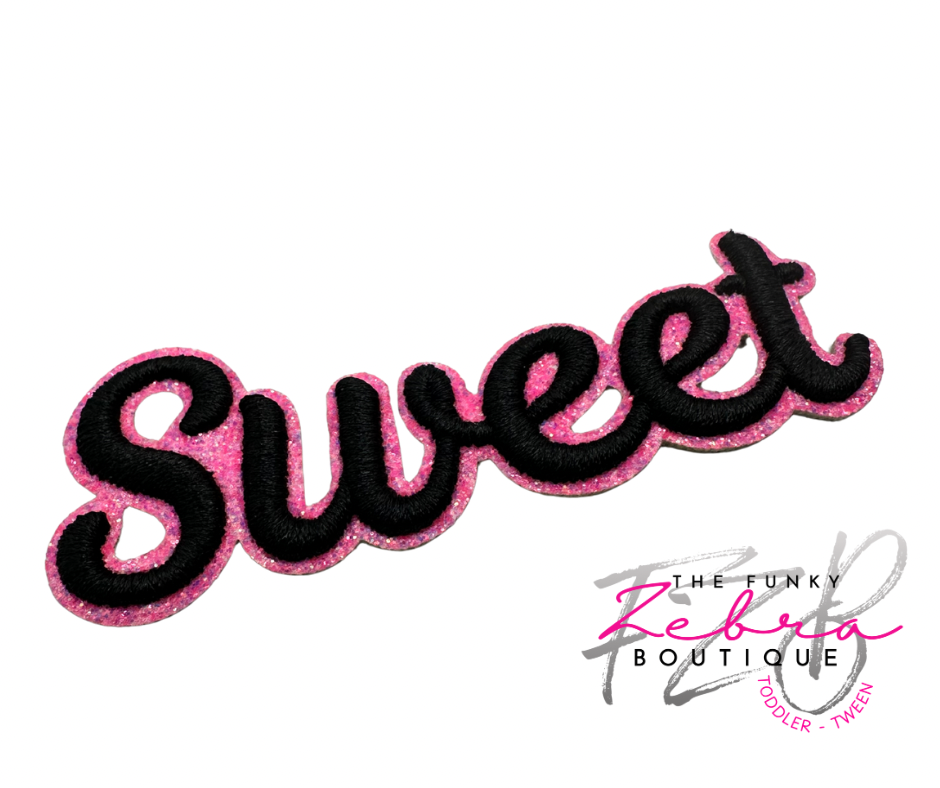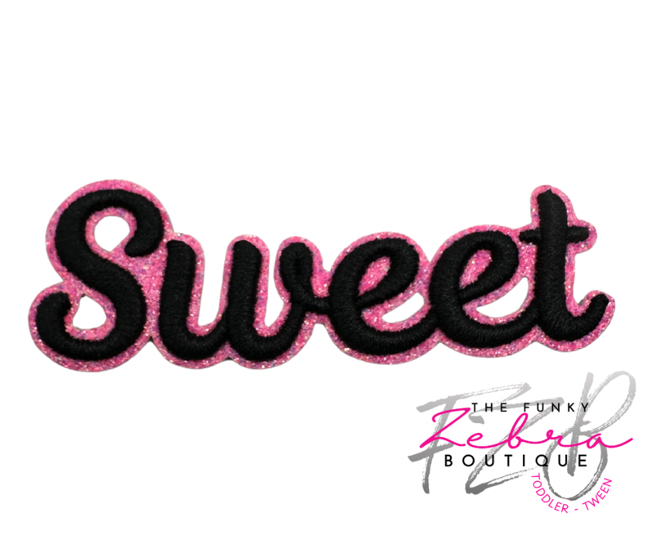 Sweet! This sweet word embroidered patch features a 3D puff black thread outlined in neon pink glitter.