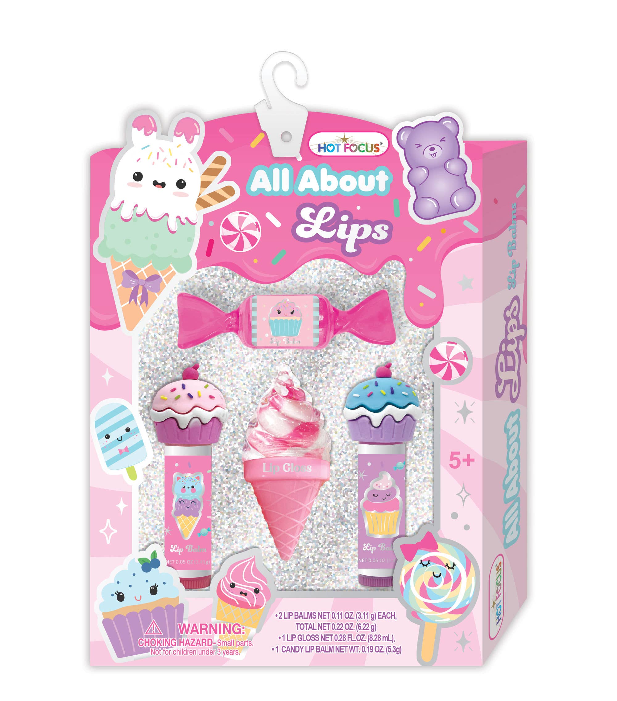Contains: • 2 Lip Balms • 1 Lip Gloss • 1 Novelty Candy lip Balm