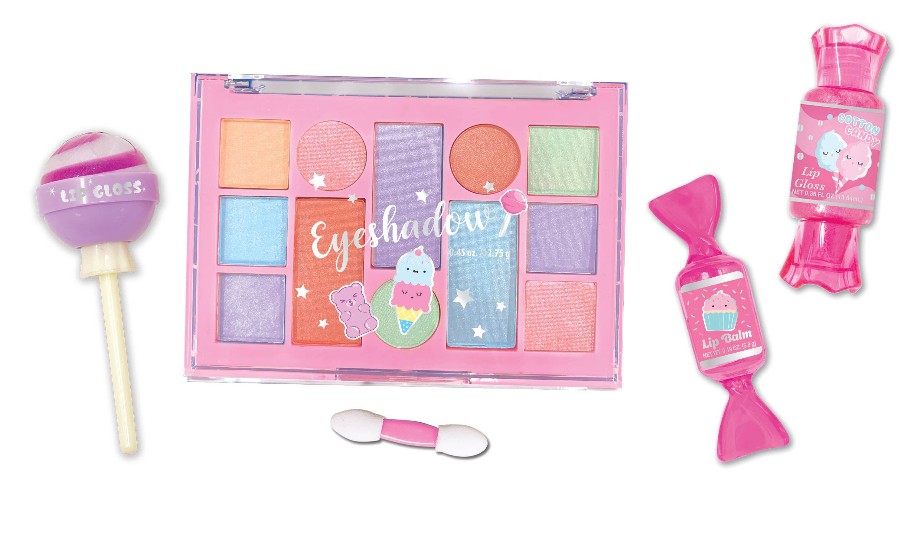 Contains: 12 Color Eyeshadow pallete 1 Eyeshadow Applicator 1 Lollipop shaped Lip Gloss 1 Candy Shaped Lip Balm