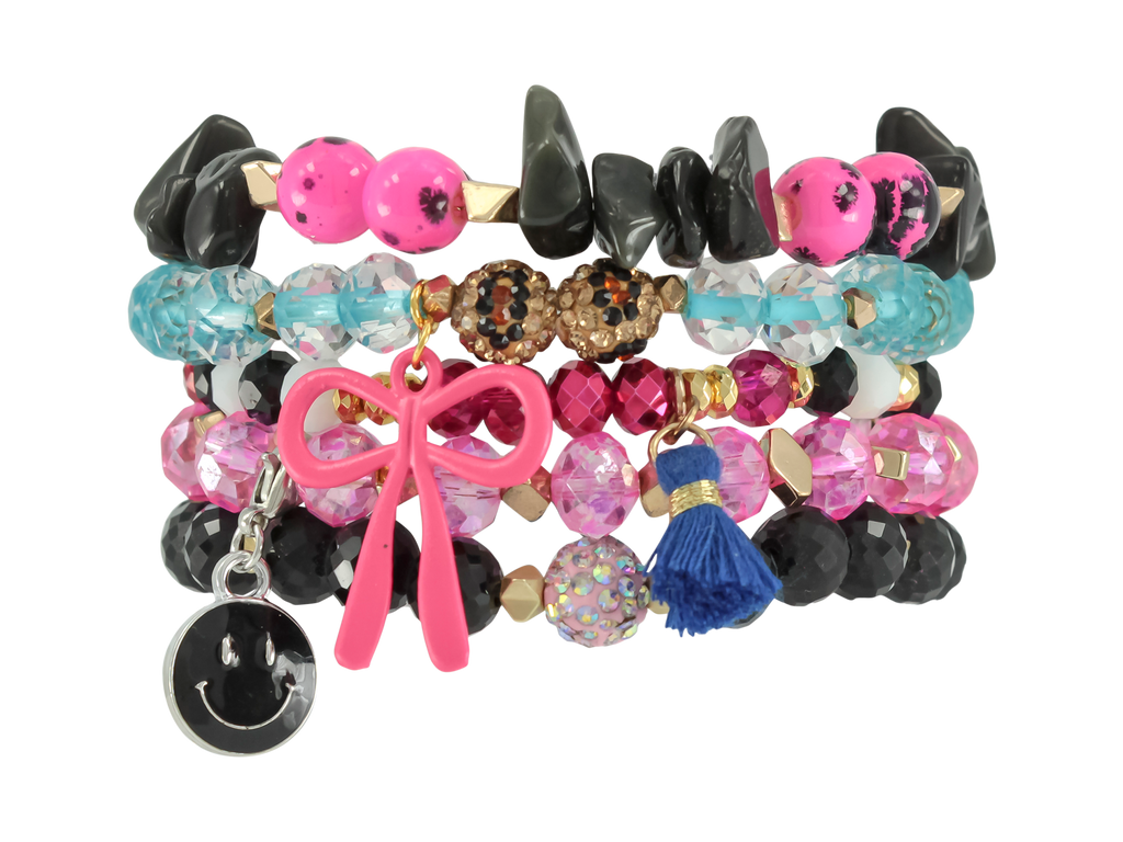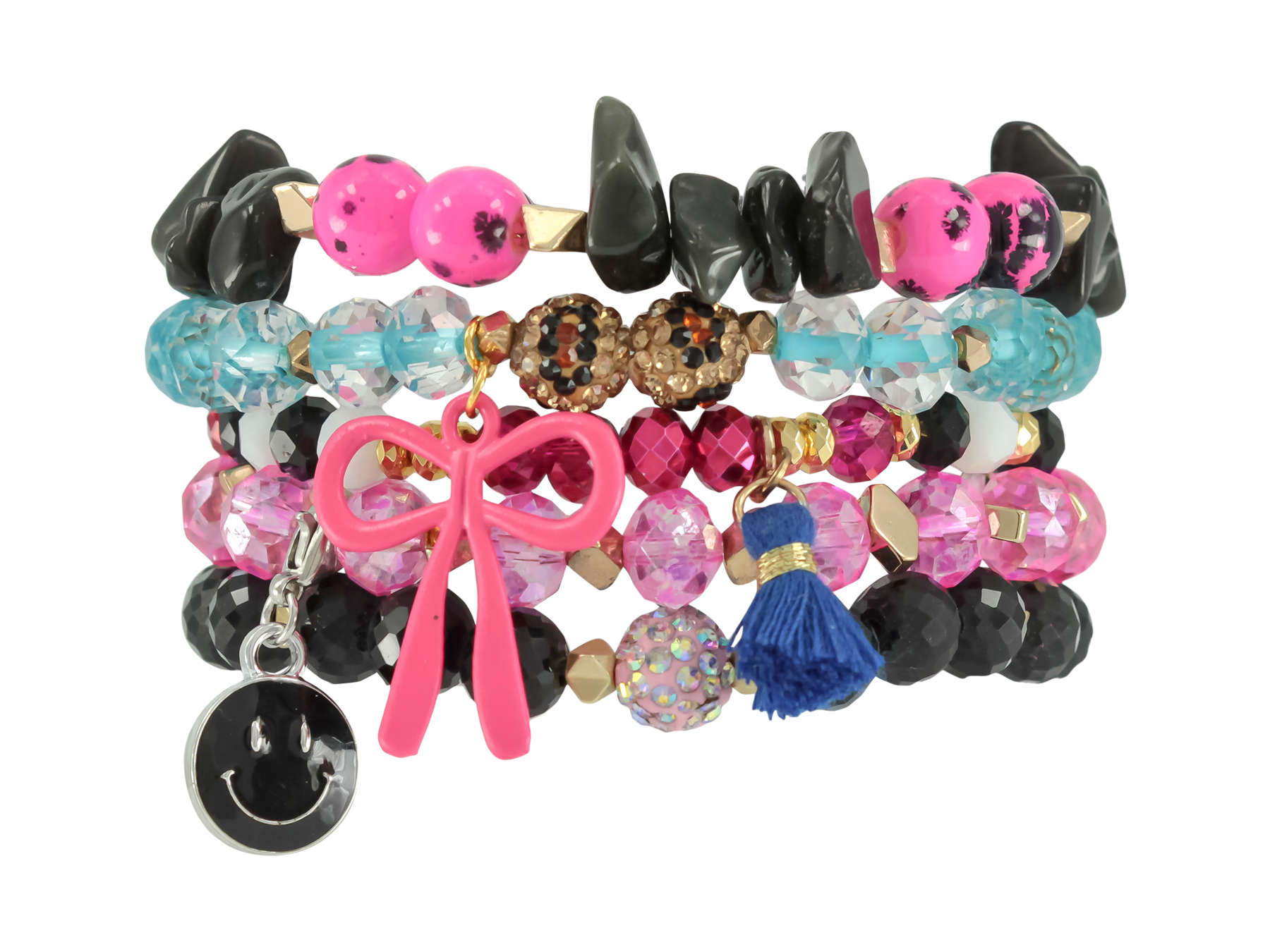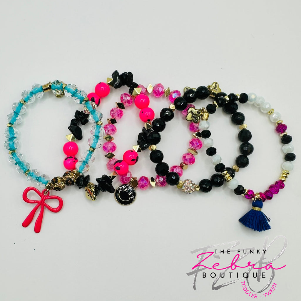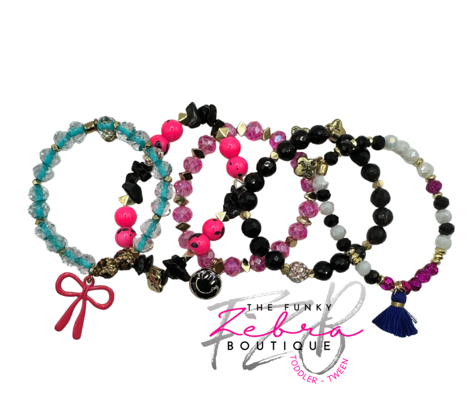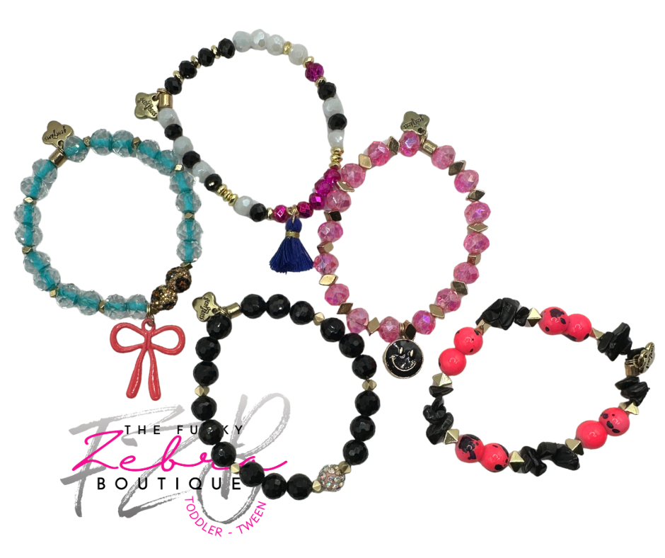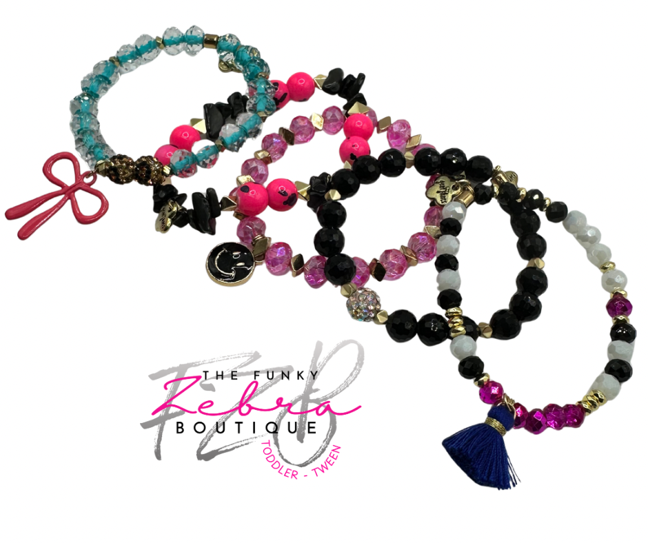 The Gem Jams (KIDS) Fluffy Stack is made up of fun leopard, pink and black colored bracelets! All stretch and all synthetic stones. Bracelets are 'one size fits most' and are designed to fit wrists up to 6.5" comfortably. Fits ages 4 to tween. Lead & Nickel FreeΒ