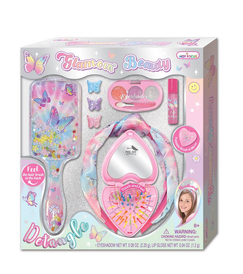 Contains: 1 Detangling Hair Brush 1 Heart Shaped Foldable Hair Brush with Mirror 1 Headband 3 Mini Hair Claws 1 Lip Gloss 1 Eyeshadow Palette with Applicator