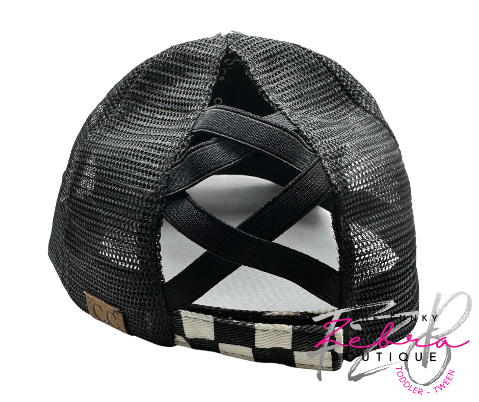 • OSFM One Size Fits Most CC brand Black & White Checkered print washed denim fabric with mesh back. Elastic crisscross ponytail opening and adjustable velcro closure.Β