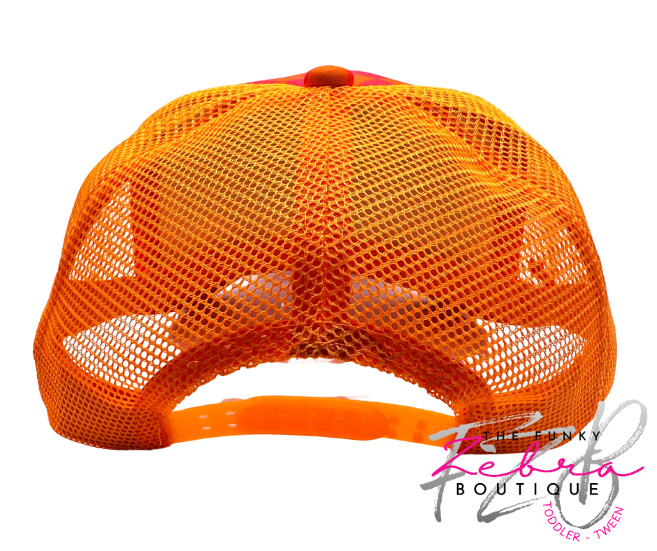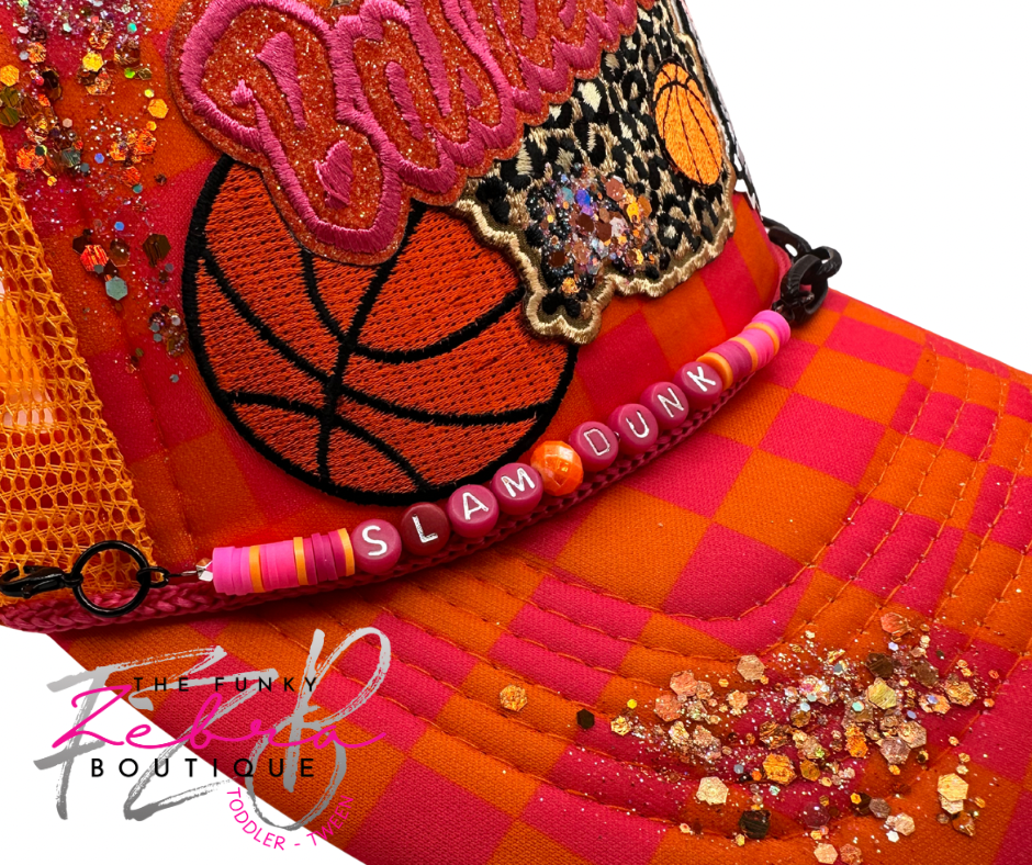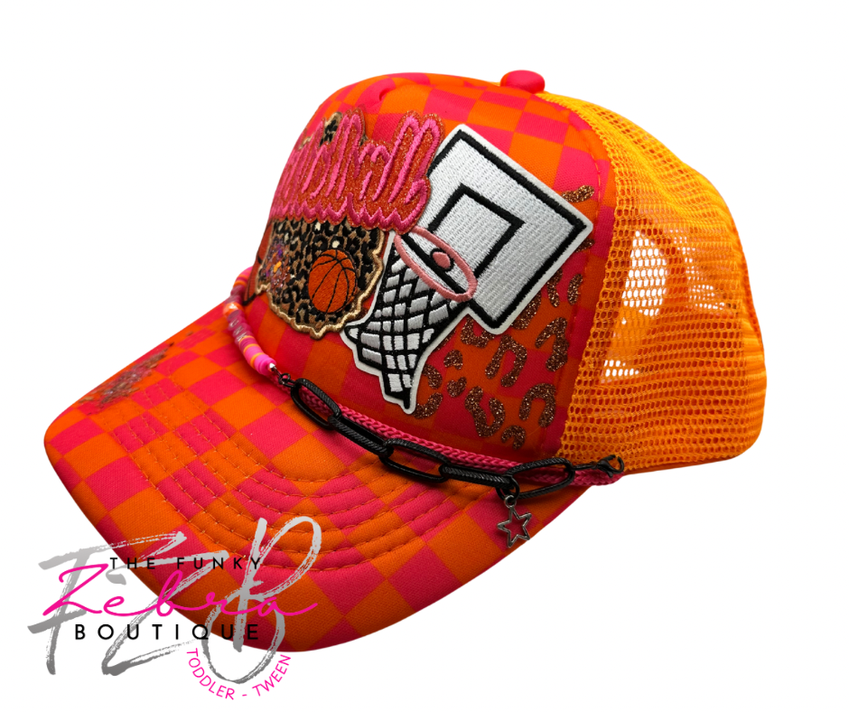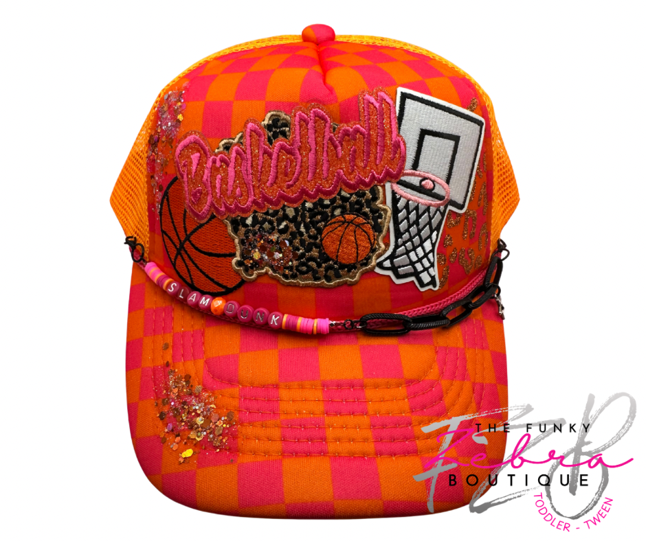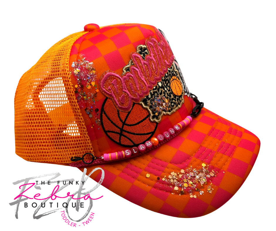 Introducing the ultimate hat thatβs a dazzling cross between a Barbie dream and a basketball fanaticβs paradise! This pink and orange checkered marvel screams "Slam Dunk!" with patches and embroidered flair so bold it could blind your opponents.
