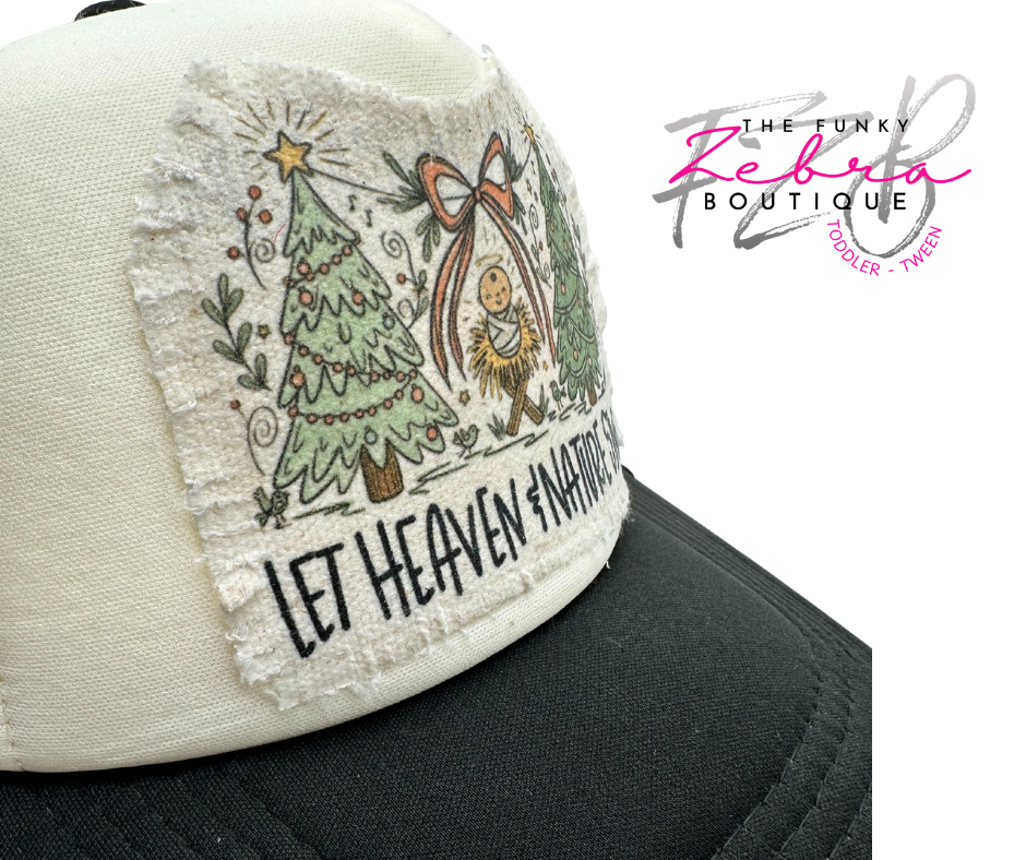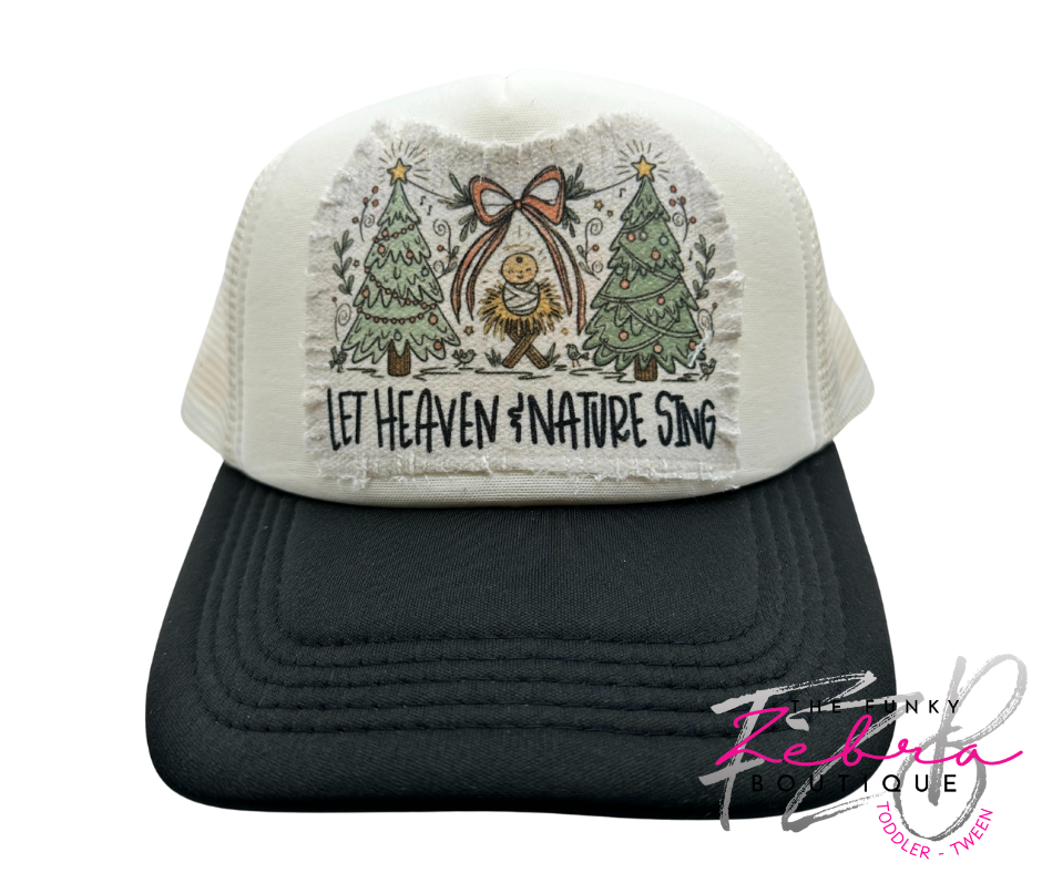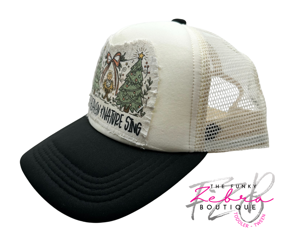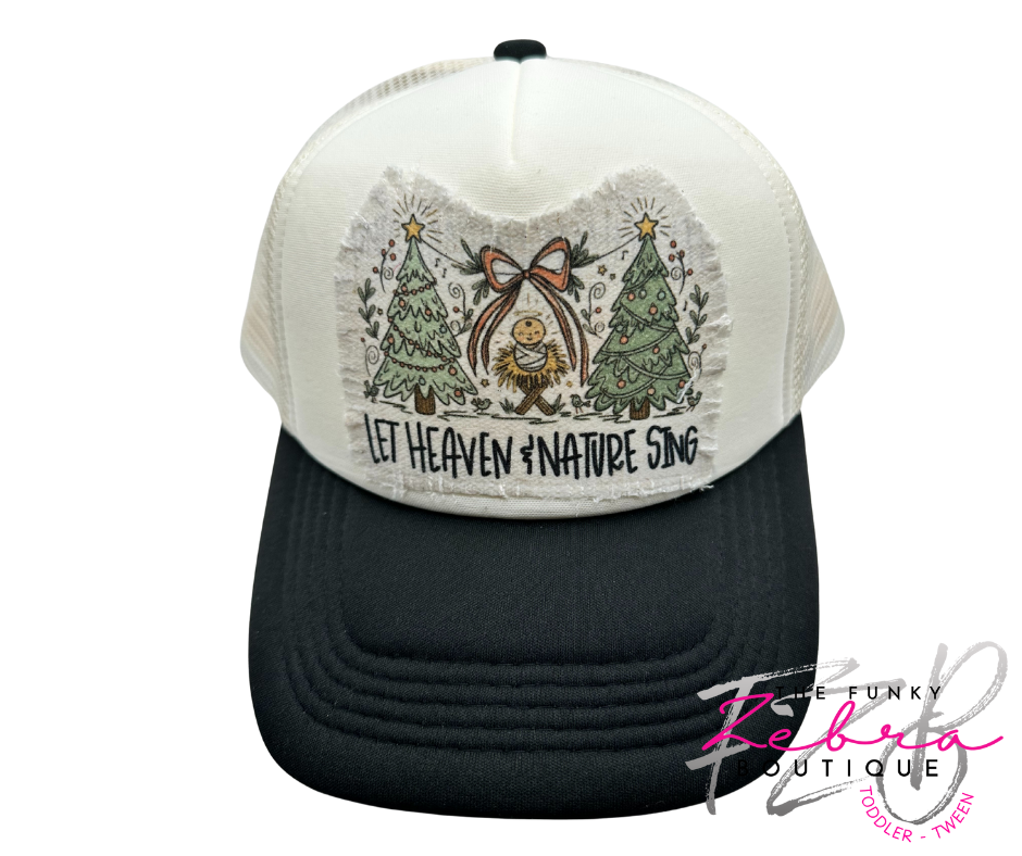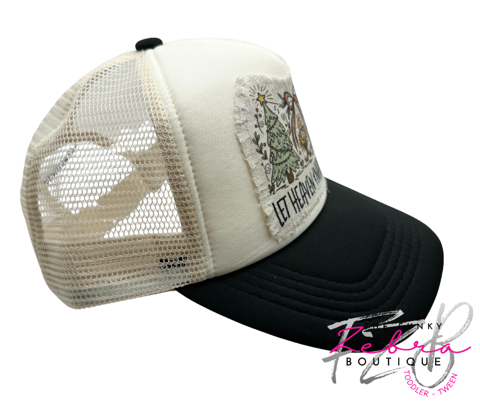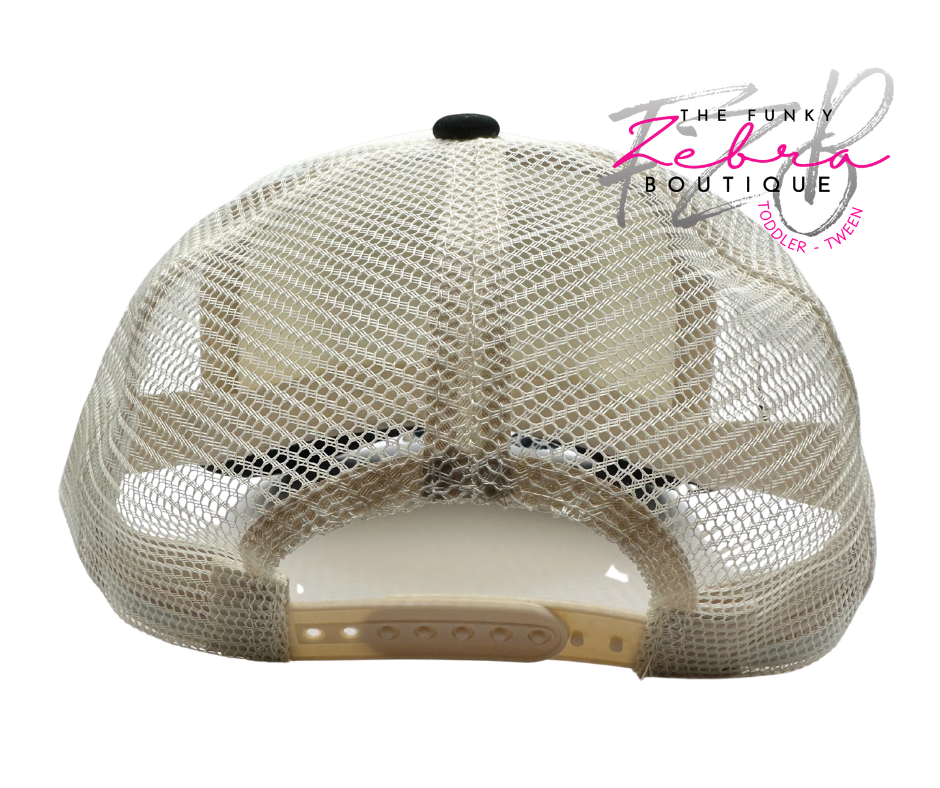 All adorned on a non-branded ivory and black foam front trucker hat with mesh back and adjustable snap closure. This hat is OSFM (one size fits most) adult size.