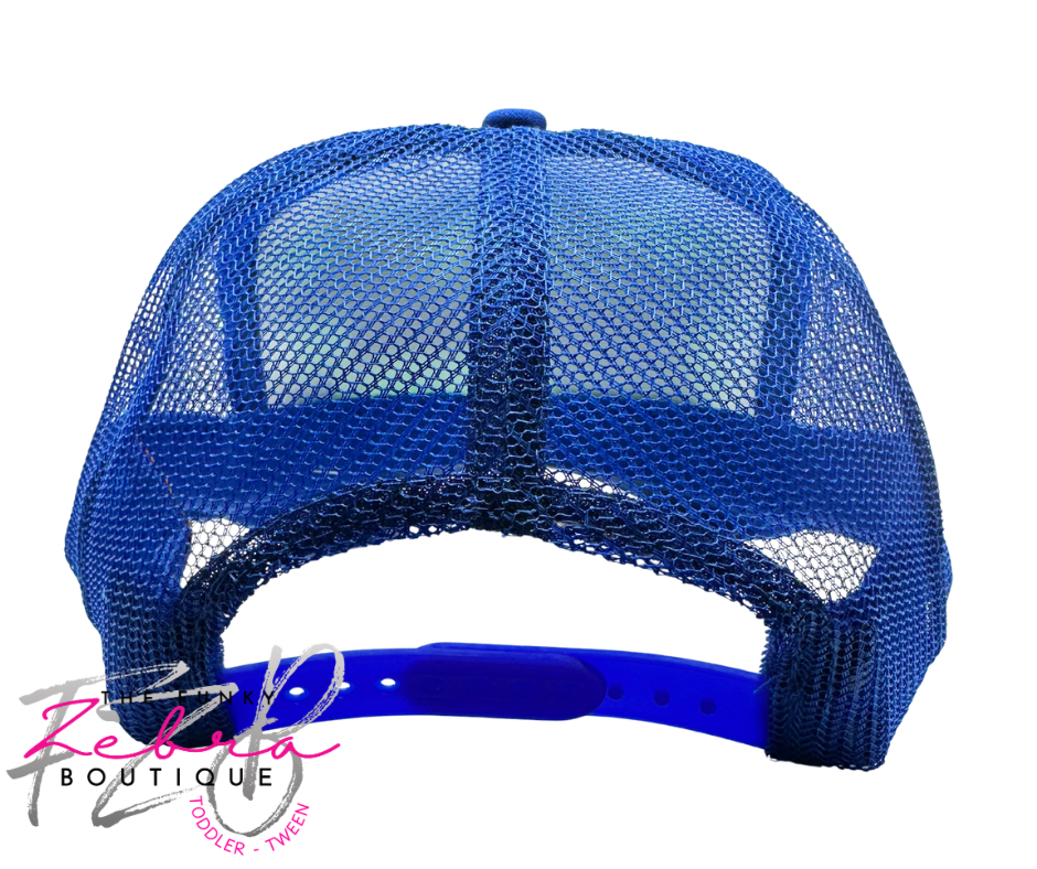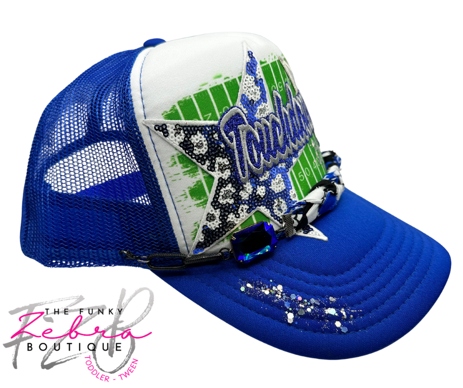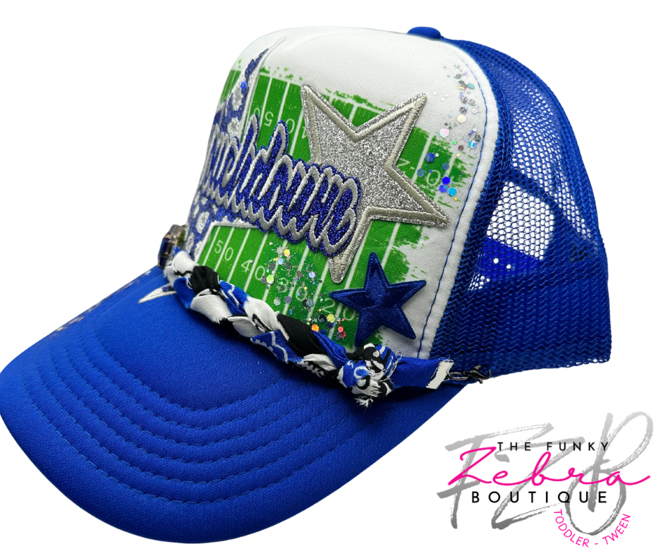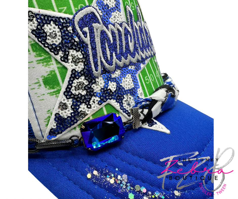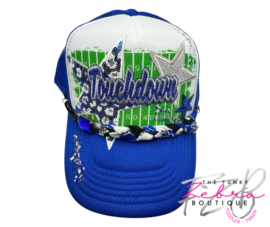 This sweet handmade foam trucker patch hat is the perfect way to cheer on your favorite football team. A trio of sequin, glitter and embroidered stars with a custom made Touchdown patch in royal blue glitter and grey embroidered outline layered on top of a sublimation football field background. A few dashes of iridescent silver glitter and a braided bandana hat chain finish this hat off. All adorned on an OTTO brand Adult Royal Blue and white foam front trucker hat with mesh back and adjustable snap closure.