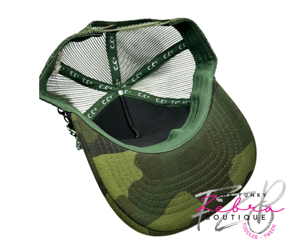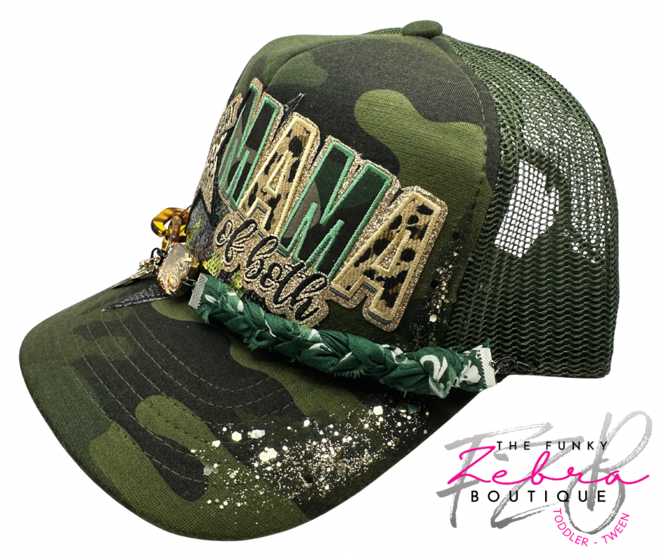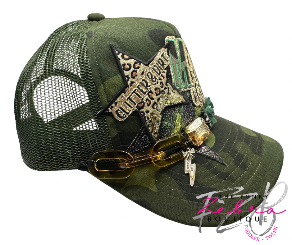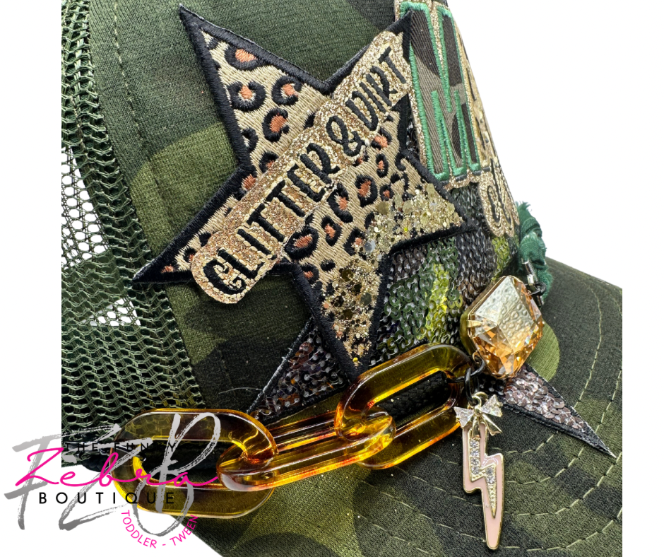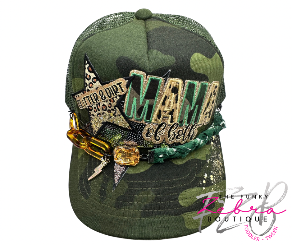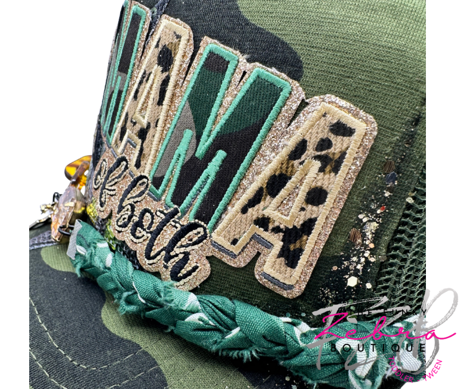 This sweet handmade foam trucker patch hat is the perfect for a Mama of both girls and boys. A sequin camouflage star adorns the background layered with a leopard print star and Mama of both patch. A mixed media hat chain with braided bandana, chunky rhinestone and oval tortoise linking beads finishes this hat off.Β  A couple of blingy charms adds sass. All adorned on a C.C. brand Adult camouflage foam front trucker hat with mesh back and adjustable snap closure.