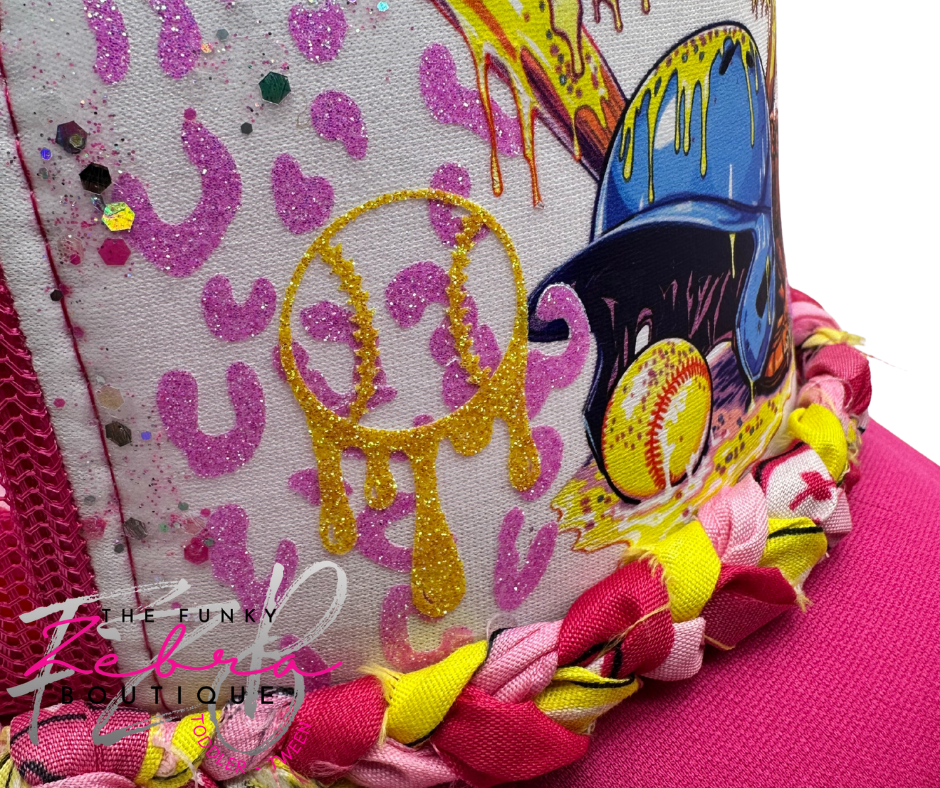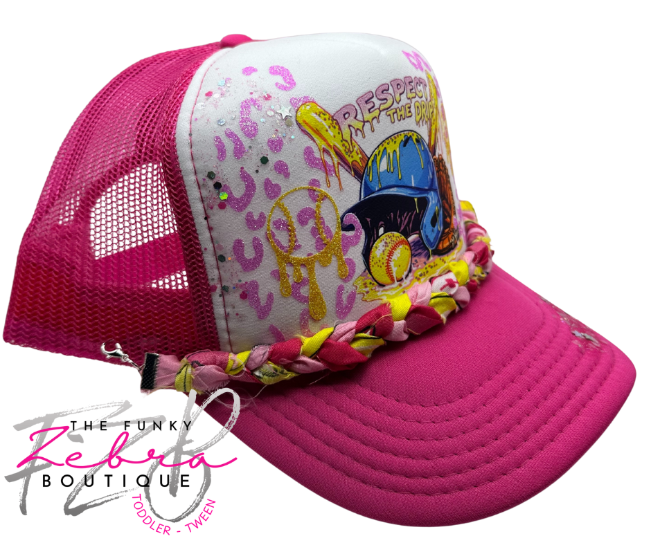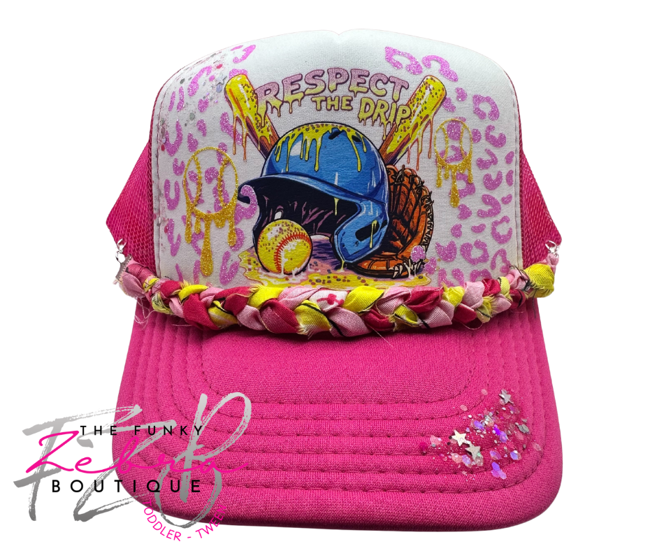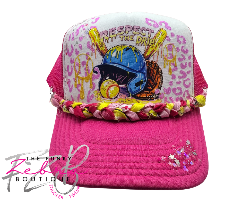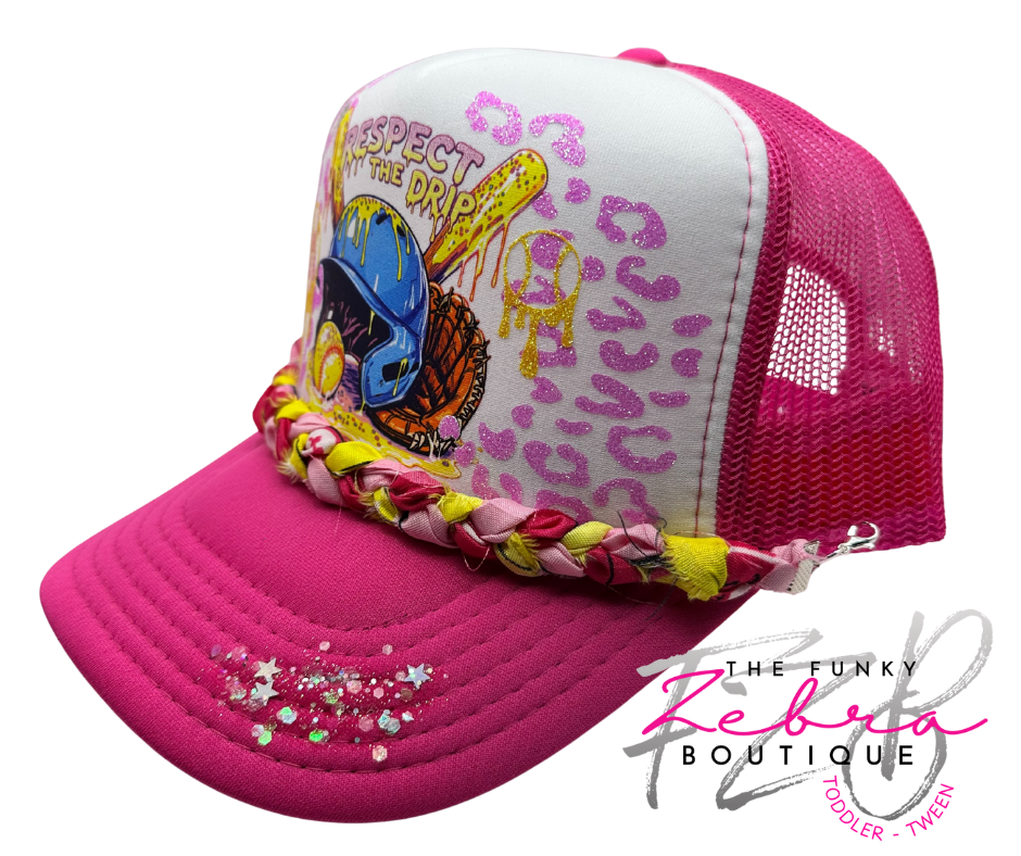 This handmade foam trucker patch hat features a DTF (direct to fabric) Respect the Drip graphic surrounded by pink glitter leopard print vinyl, yellow softball drip vinyl and splashes of glitter.Β A braided bandana hat chain adds that special pop.