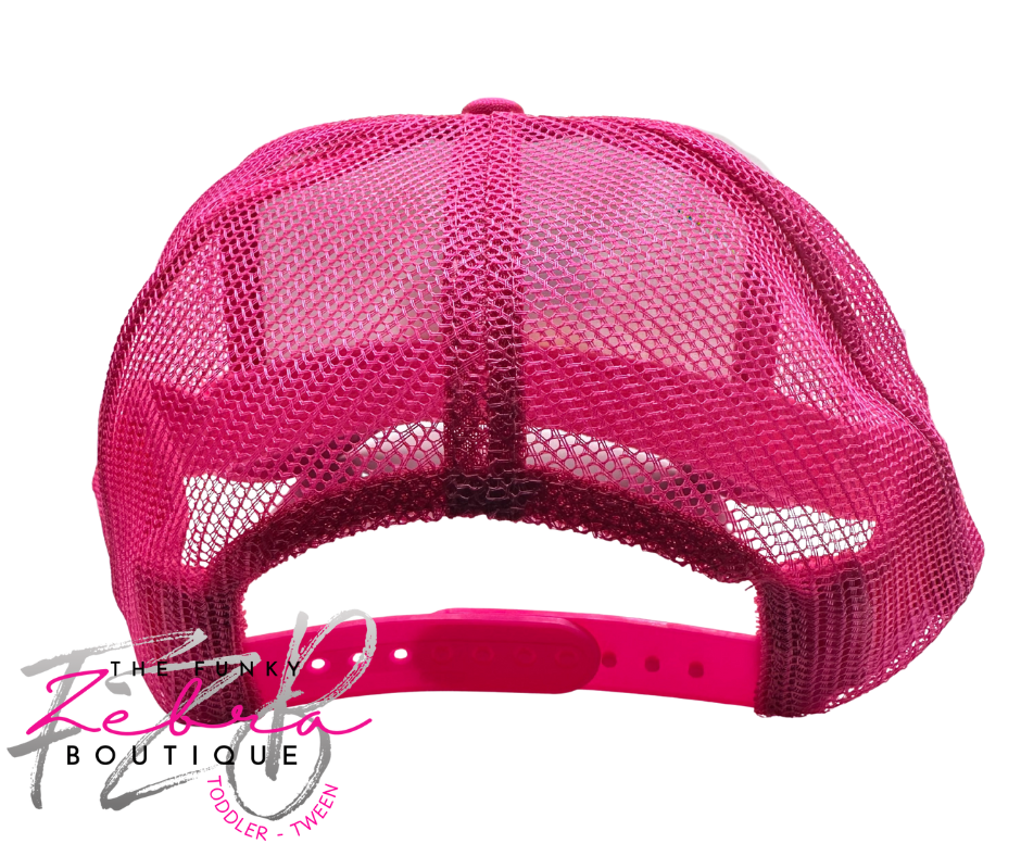 All adorned on an OTTO brand white foam front neon pink trucker hat with adjustable snap closure. This hat is OSFM (one size fits most) adult size.