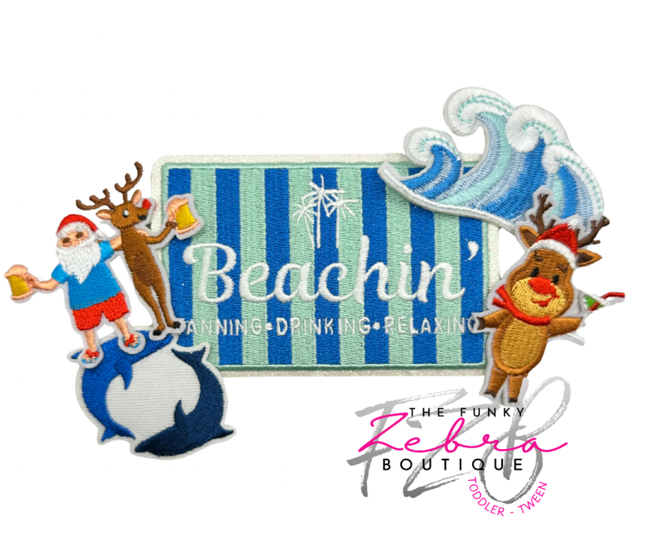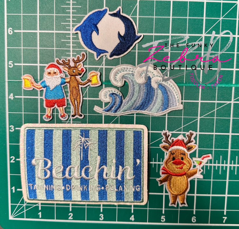 Christmas Beachin' Tropical Vacation Dolphin Santa and Reindeer Embroidered Iron On Patches Set of 5