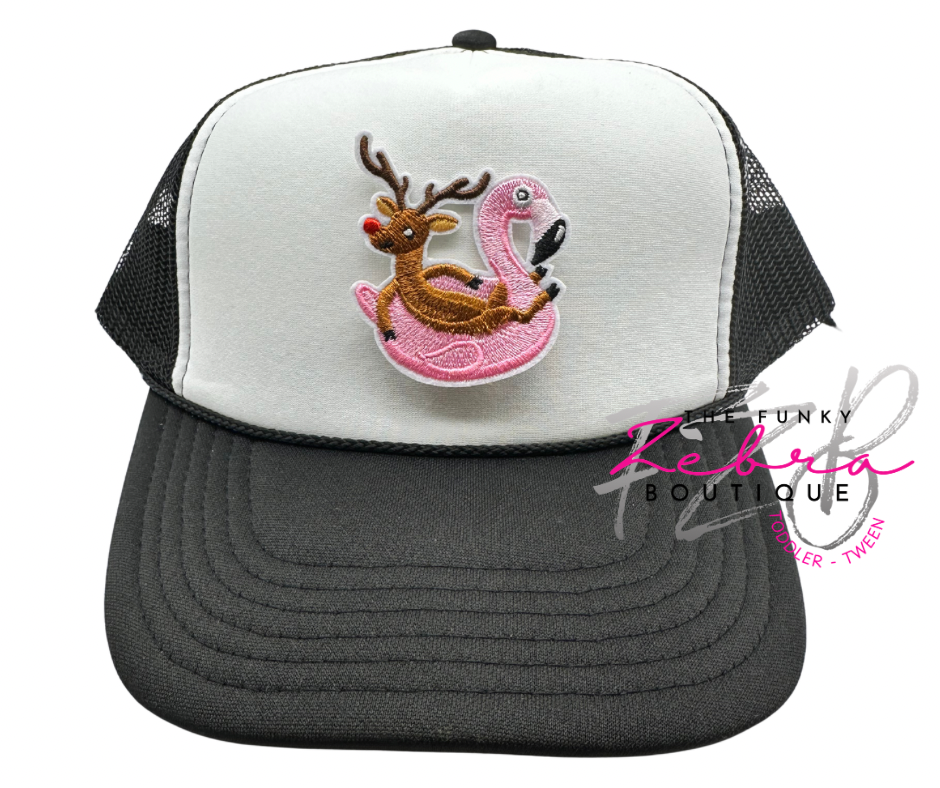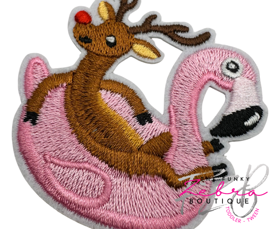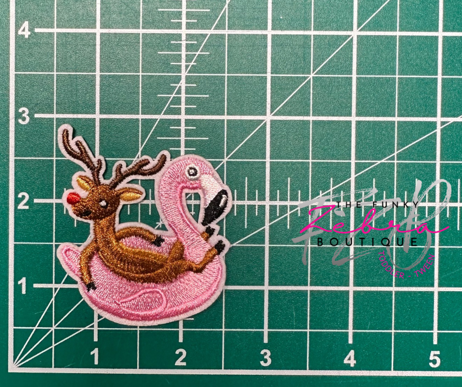 So fun! This red nose reindeer floating on a flamingo pool float patch is the perfect addition to your project.