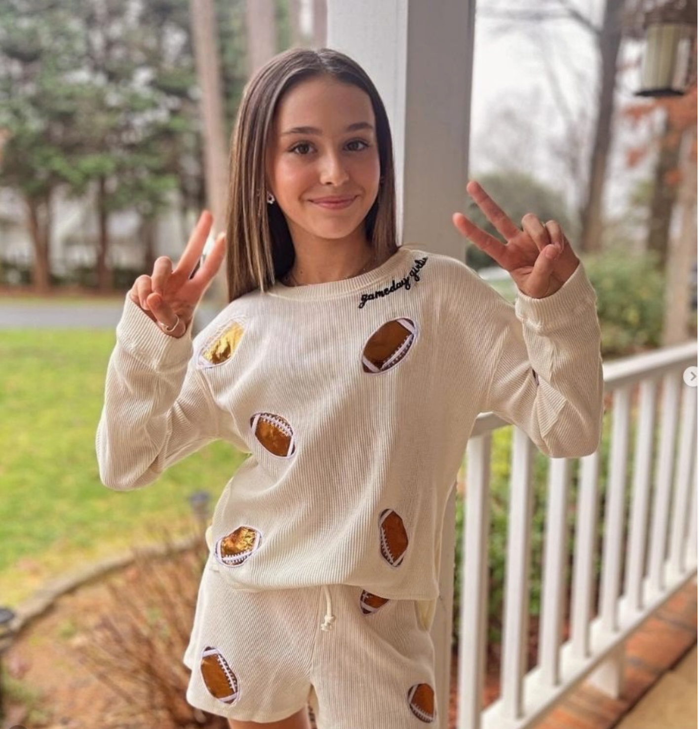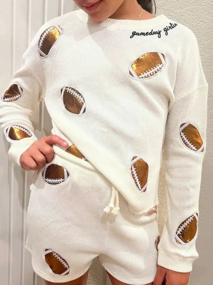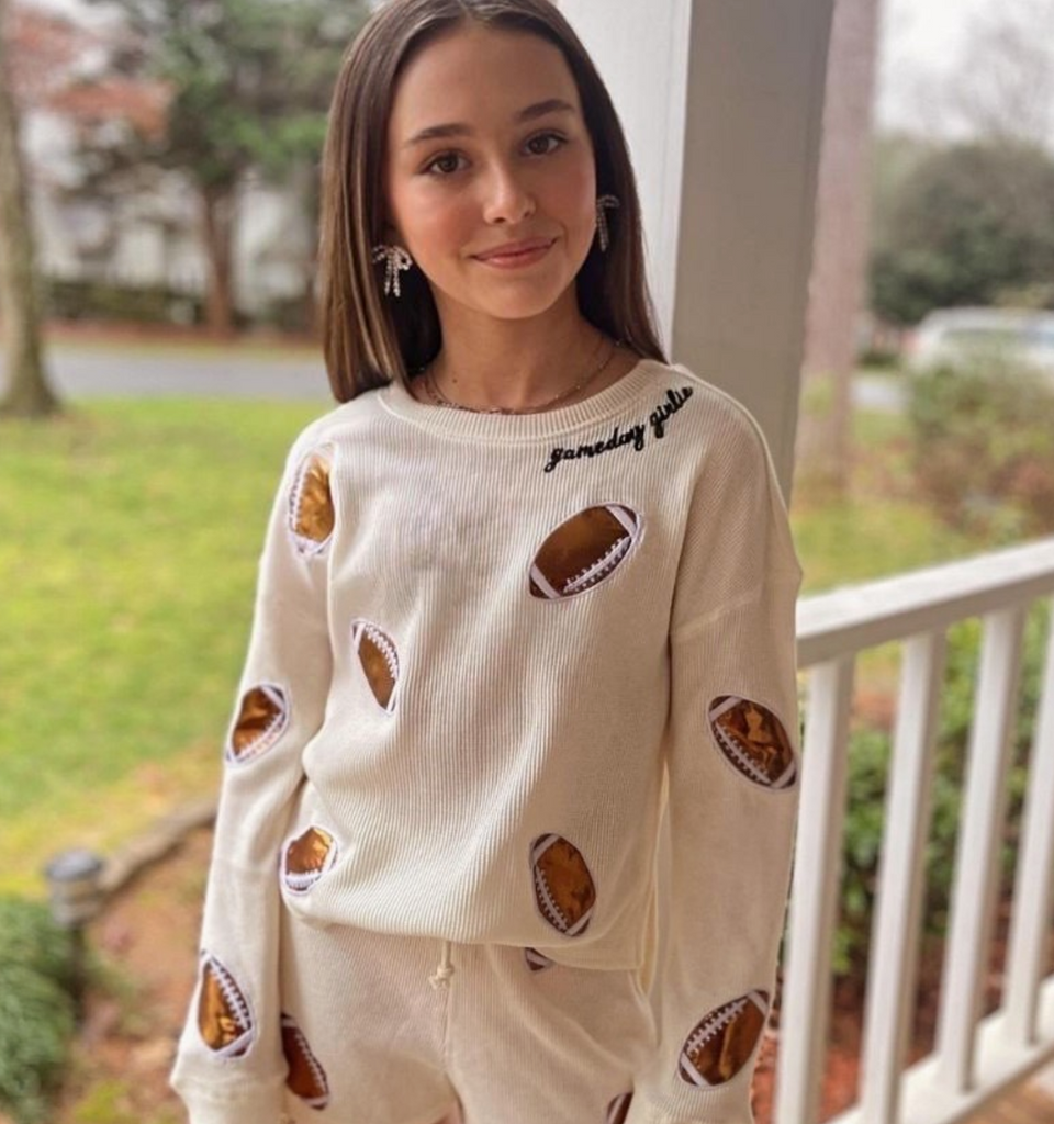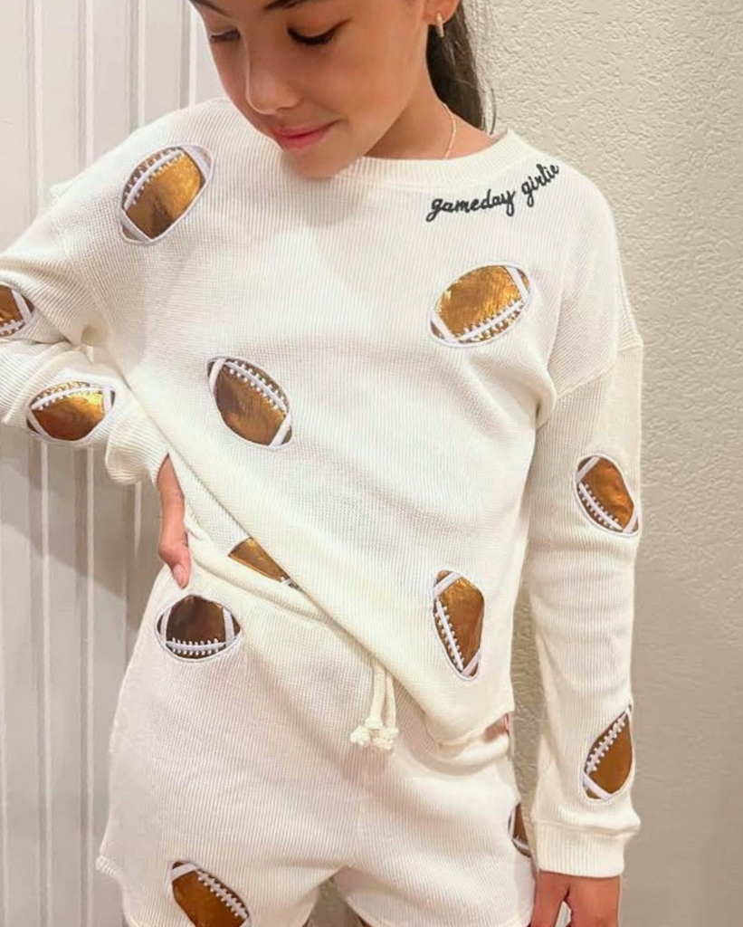 SaleThe details.......creamy waffle knit long sleeve top with "gameday girlie" in black cursive thread on the top left collar with metallic copper applique footballs all over the front. The back of the top and sleeves do not have footballs.
